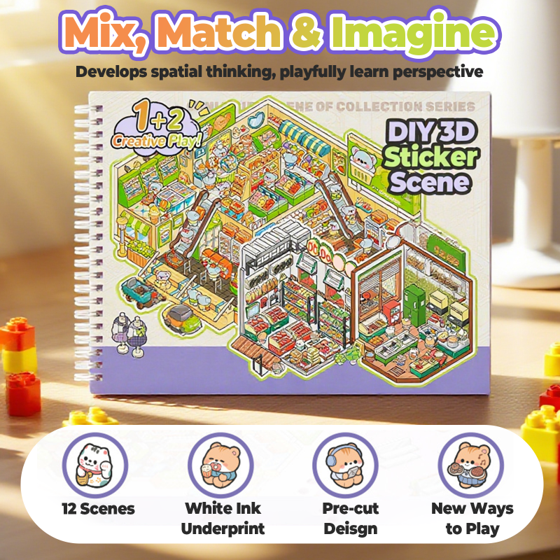 TELL YOUR OWN MAGICAL STORY - Dive into a magical realm with uniquely themed 3D scene stickers, from enchanting shops to vibrant landscapes. Each set bursts with charming cartoon patterns, inviting users of all ages to weave tales and embark on creative adventures filled with whimsy and joy.