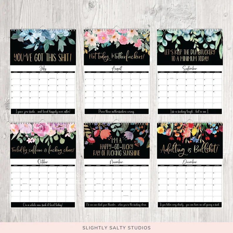 This cuss word 2024 Wall Hanging Calendar features TWO funny cuss word quotes per month for the year of 2024. This hanging wall calendar features a hook to hang on the wall, is vertical and sized 11" x 8.5".