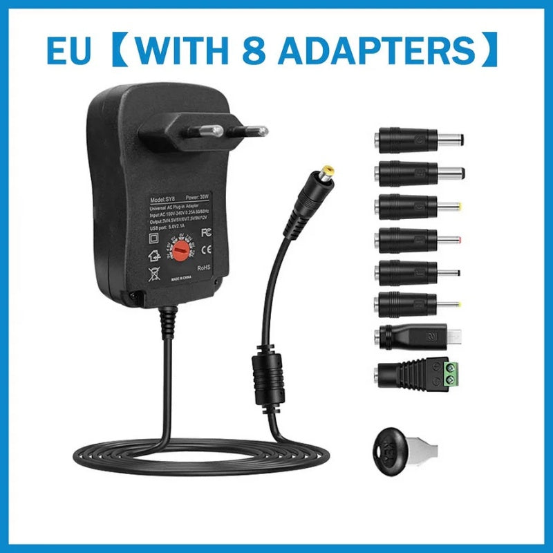 30W UNIVERSAL POWER ADAPTER: AC input 100‑240V 0.25A 50/60Hz; DC output 3V/4.5V/5V/6V/7.5V/9V/12V adjustable; 5V 2.1A, with a USB port.