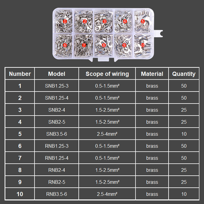 The 320 PCS Terminal connection combination set will make your wiring work much safer and more convenient. This set includes a range of sizes and combinations to meet all of your electrical needs. Made with premium brass, these terminals ensure good electrical conductivity and long-lasting durability. This set comes complete with all the necessary sizes to meet any household, vehicle, garage, workshop, outside project, and more. This versatile set is perfect for DIY enthusiasts who want to tackle electrical work with confidence. The Terminal connection combination Set is an essential addition to your toolkit that you can depend on.