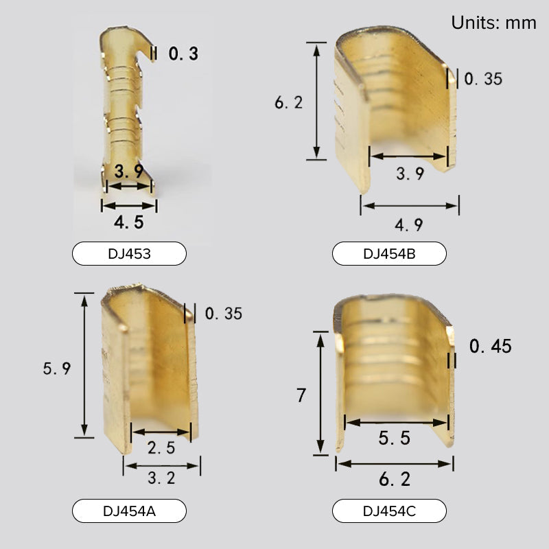 WHAT YOU GET - This set includes DJ-454A, DJ-454B, DJ-454C, DJ-453 terminal connectors, each size for 100pcs, 400pcs in total. Crimp terminals of different sizes and shapes can help you cope with cables of various sizes.