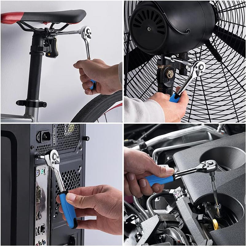 * [Reversible Ratchet]: This 72-teeth ratcheting wrench is designed as a push button ball-bearing quick-release mechanism for easy socket changing, the reverse switch that improves efficiency and performance. The ratchet needs only a 5-degree swing arc.