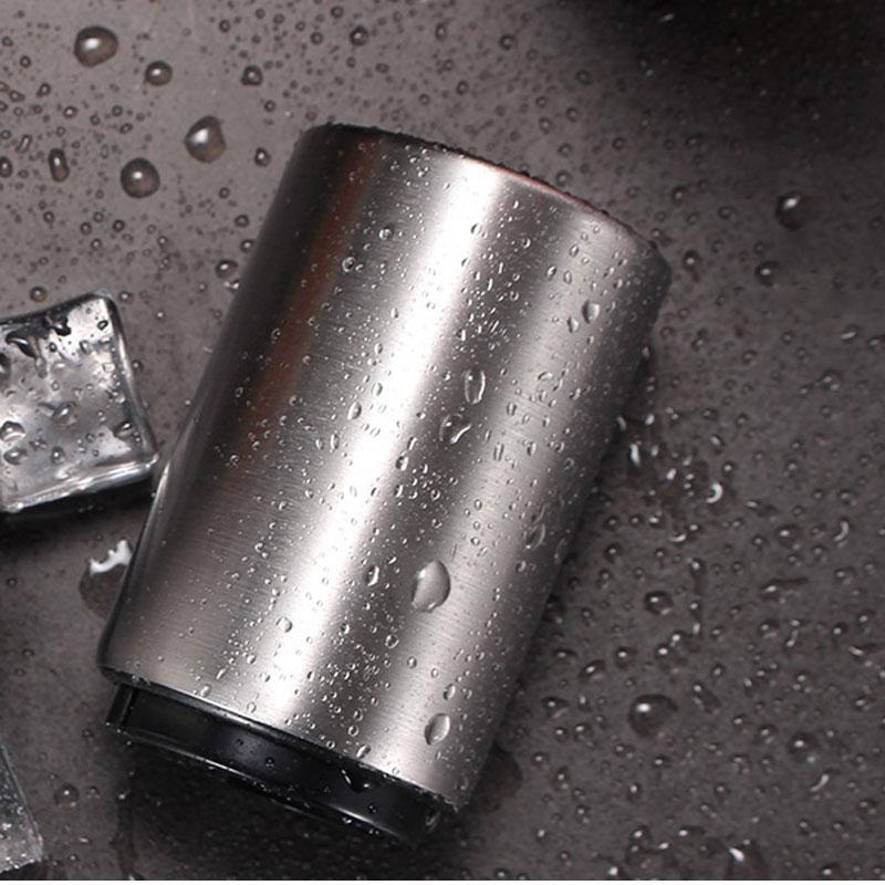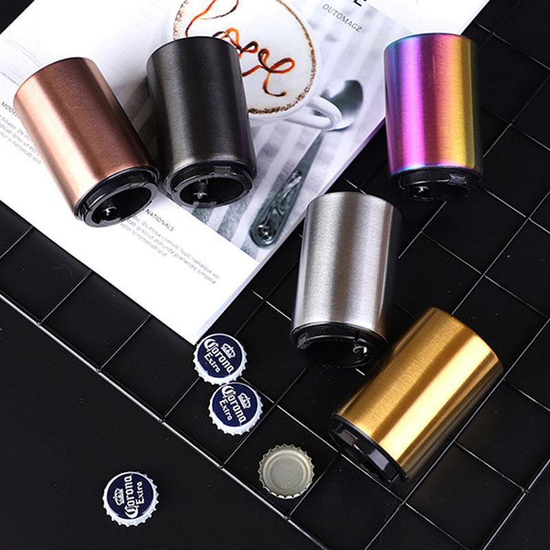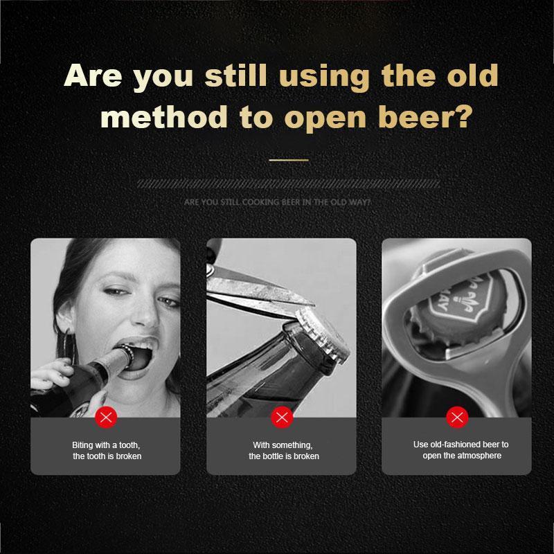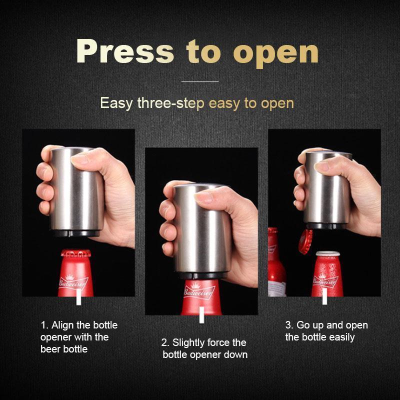 Creative automatic bottle opener suitable for parties, packed with portable beer bottles. It differs from other bottle openers by having a magnetic bar that can be opened by simply aligning it with the mouth of the bottle, pressing it down and lifting it up. Very easy to use!