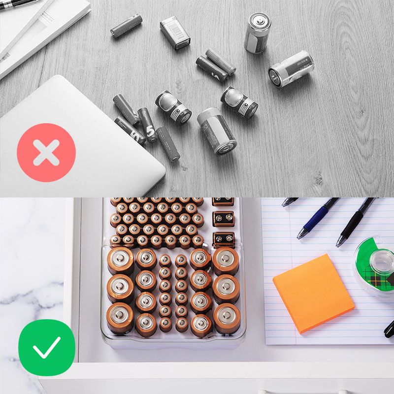 * Wall-Mounted or Drawer Use: The smart design with a clear cover can be stored in a drawer or closet or mounted on a wall in a garage or mud room, saving space and keeping the batteries well organized.
