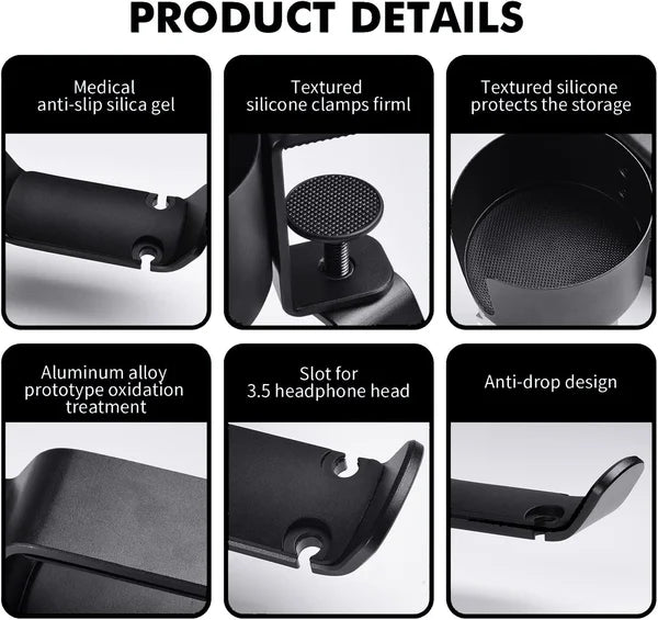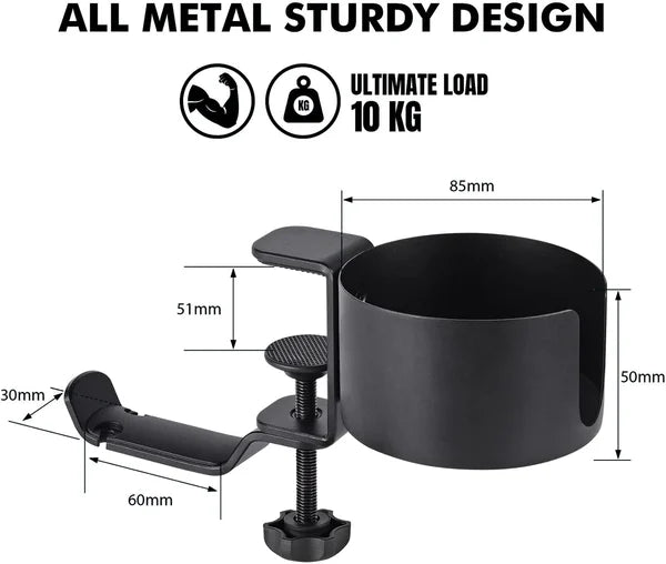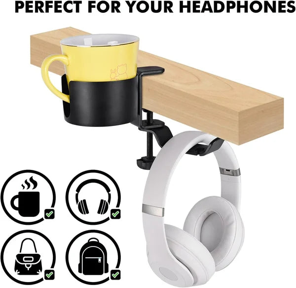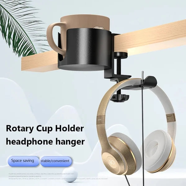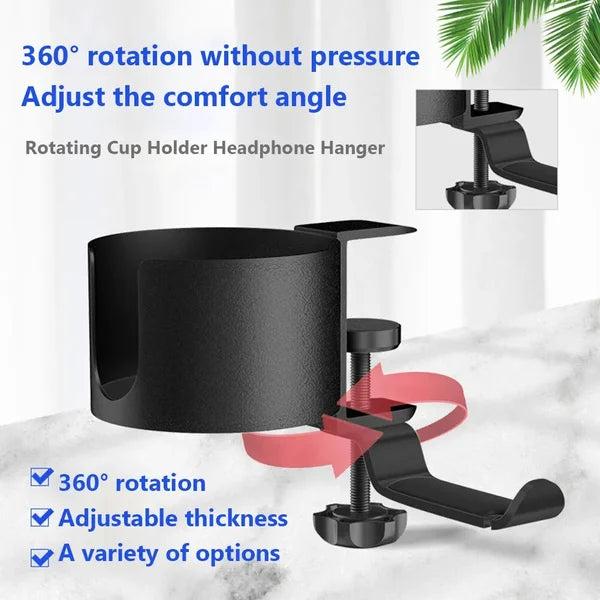 - 2-in-1 Function: Universal design for cup holder and headphone holder. You can clip the cup holder on your desk surface within 2 inch thickness with a 360° rotating arm