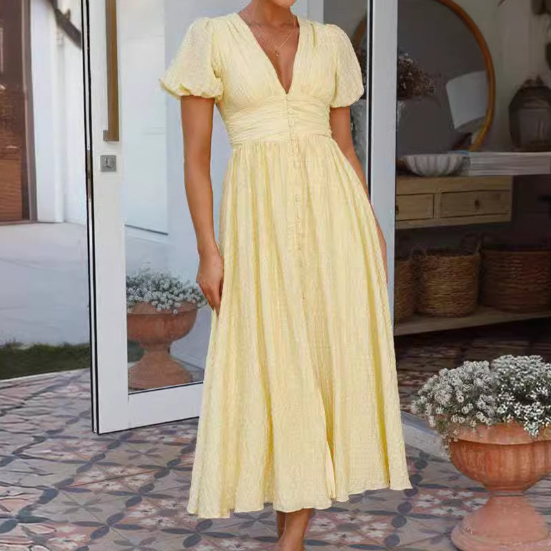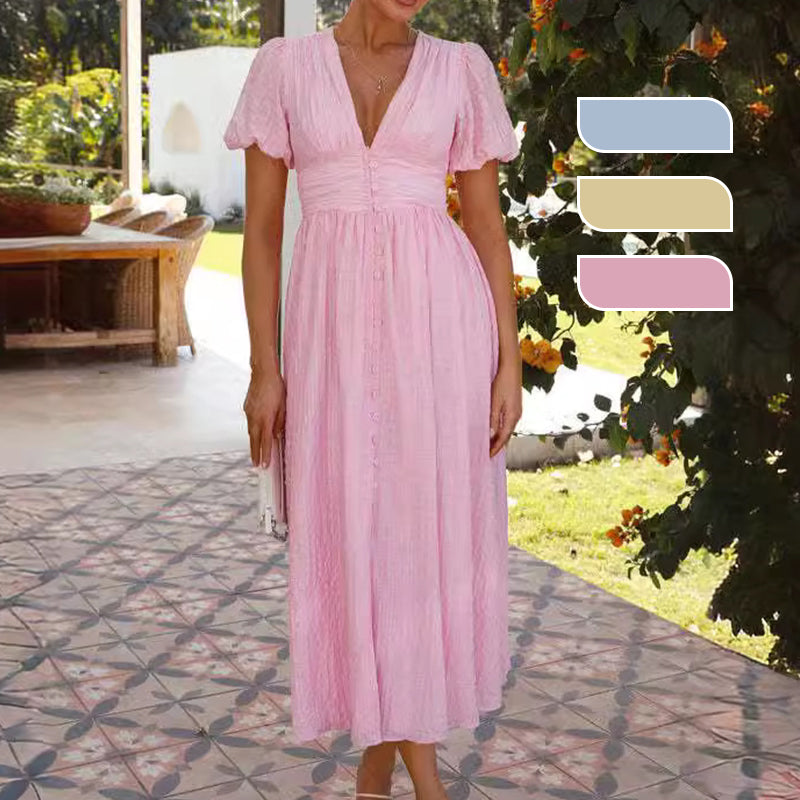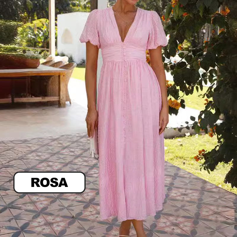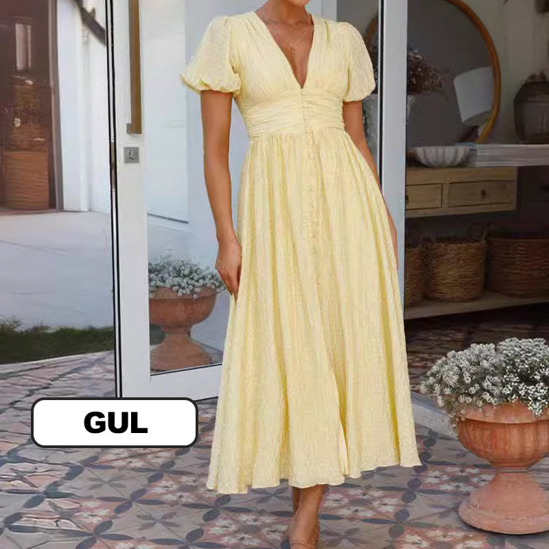 STILIG DESIGN: Denna klÀnning har en smickrande V-ringning och charmiga puffÀrmar, vilket förhöjer din look med en touch av kvinnlighet och elegans. Perfekt för alla tillfÀllen, kombinerar den enkelt stil och grace.