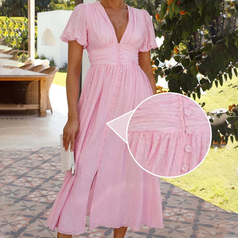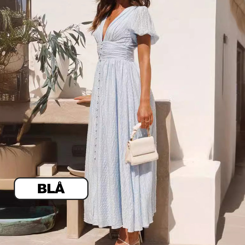âšÂ VĂ„r maxiklĂ€nning med v-ringad dragkedja och knĂ€ppning med puffĂ€rm utstrĂ„lar rustik charm.