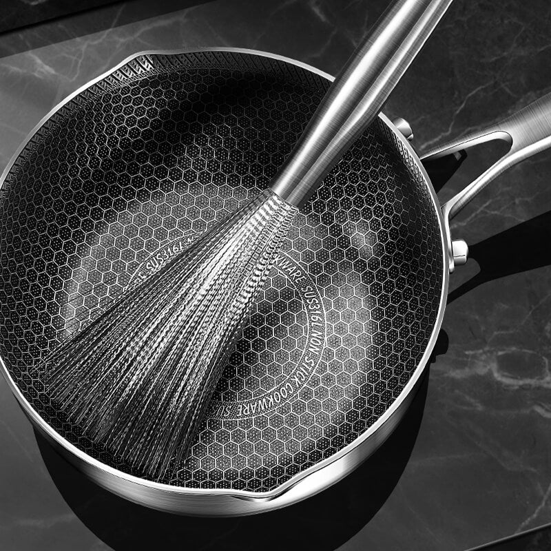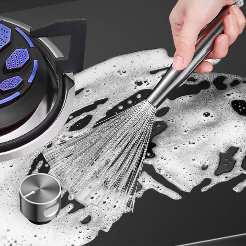 This novel steel brush is flexible and can help clean your cookware quickly without warping or bending. Unlike other brushes such as rags, bamboo scrapers, or steel ball brushes, ours have no issues with shedding, hiding food residue, and producing odors, allowing you to deep clean your cookware with no stains!