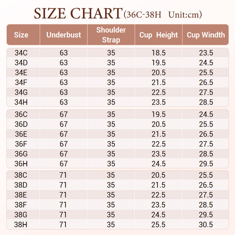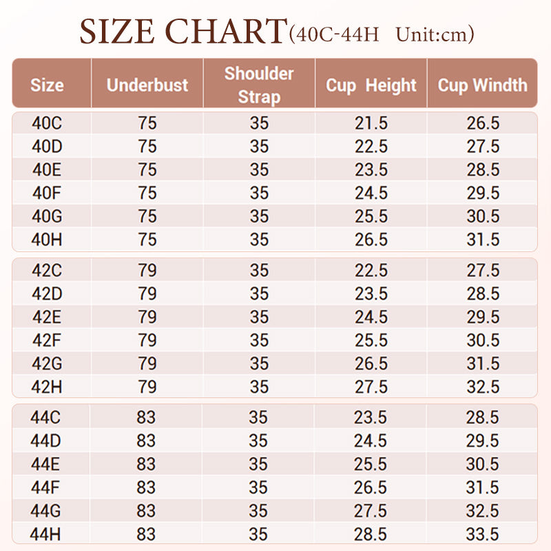 GrƶĆe: 34C, 36C, 38C, 40C, 42C, 44C, 34D, 36D, 38D, 40D, 42D, 44D, 46D, 34DD, 36DD, 38DD, 40DD, 42DD, 44DD, 46DD, 34G, 36G, 38G, 40G, 42G, 44G, 34H, 36H, 38H, 40H, 42H, 44H, 46H