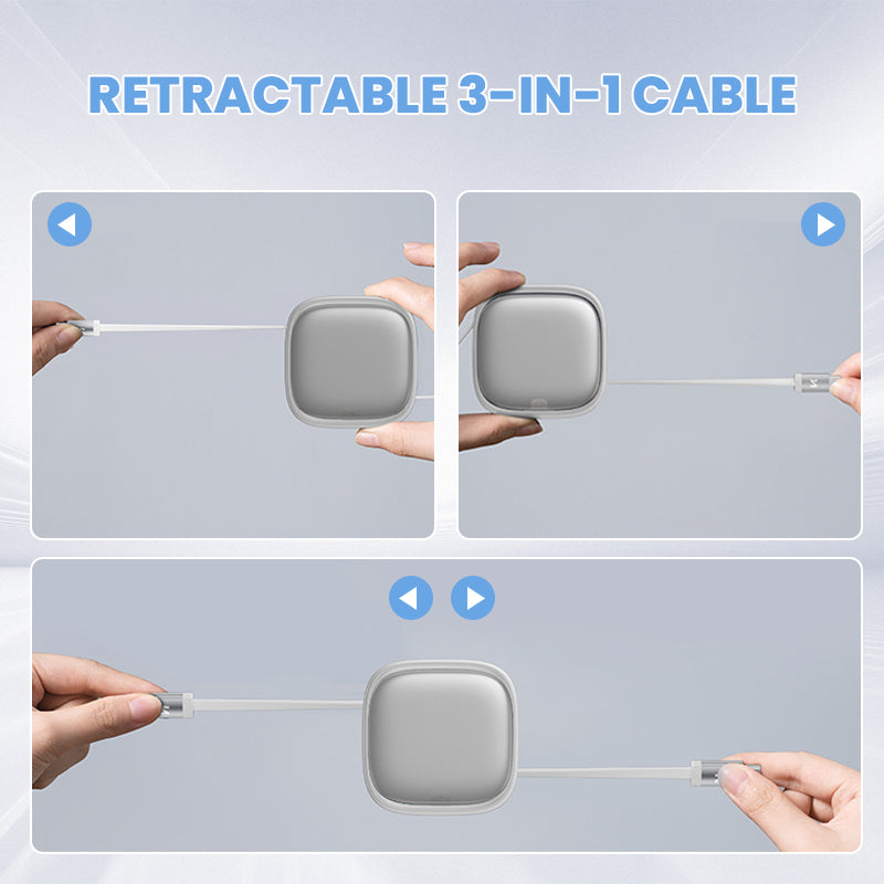 CONVENIENT AND PORTABLE: Compact and easy to carry, this retractable 3-in-1 cable is perfect for use at home, in the office, in your car, or while traveling. Its foldable design fits easily into your bag, laptop case, or pocket.