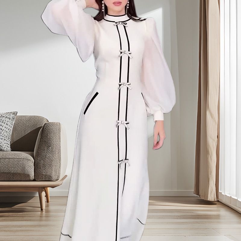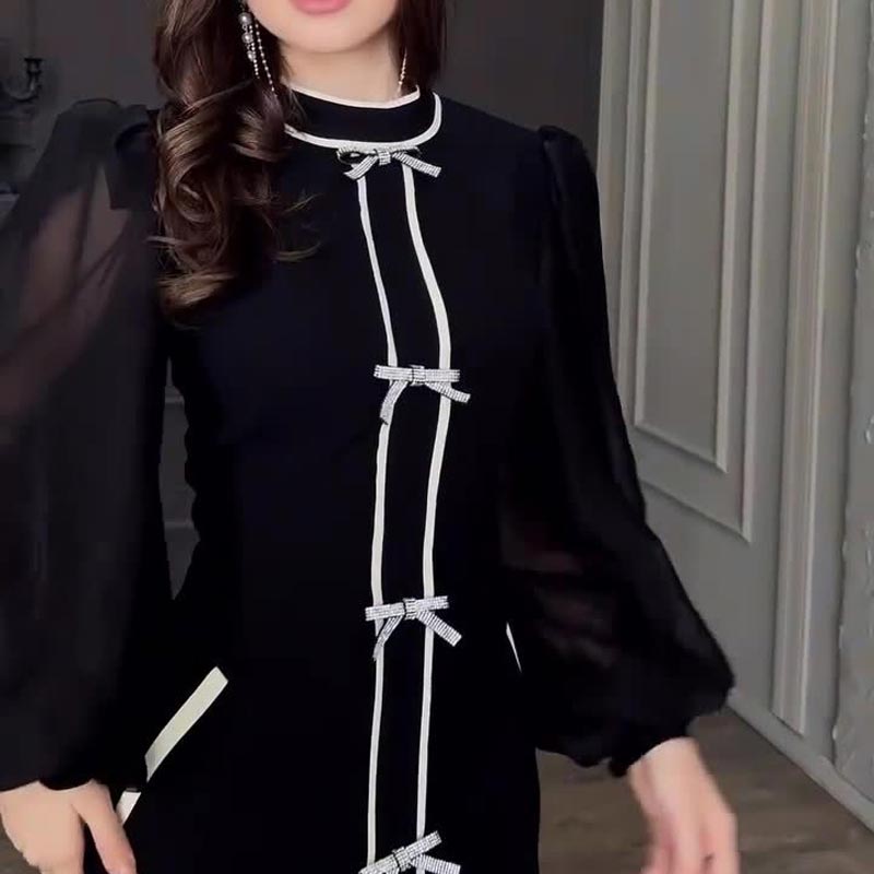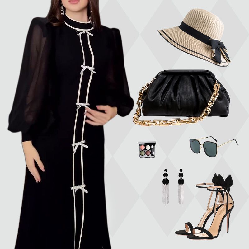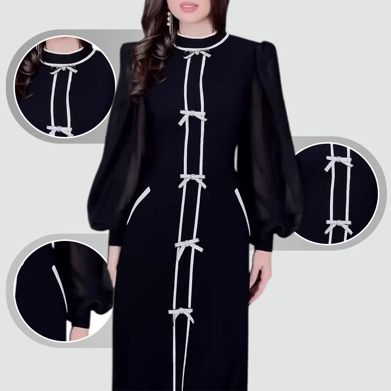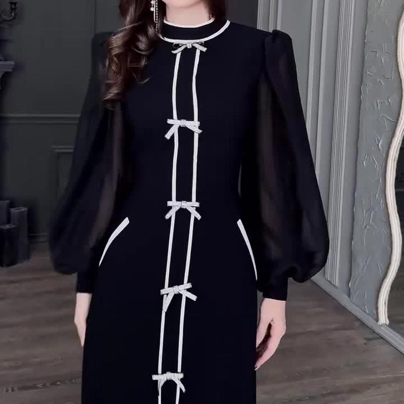 CHICK PATCHWORK DESIGN: Embrace a sophisticated look with a stylish black and white patchwork pattern and bow decor, adding elegance and structure to the dress while ensuring a polished appearance.
