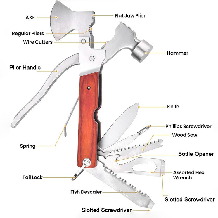 16-IN-1 MULTITOOL: Axe, hammer, nail claw, pipe grip pliers, wire cutter, pliers, knife, serrated knife, nail file, flat head, Phillips/ slotted/ hex screwdrivers, bottle opener, and fish fork to meet various needs.
