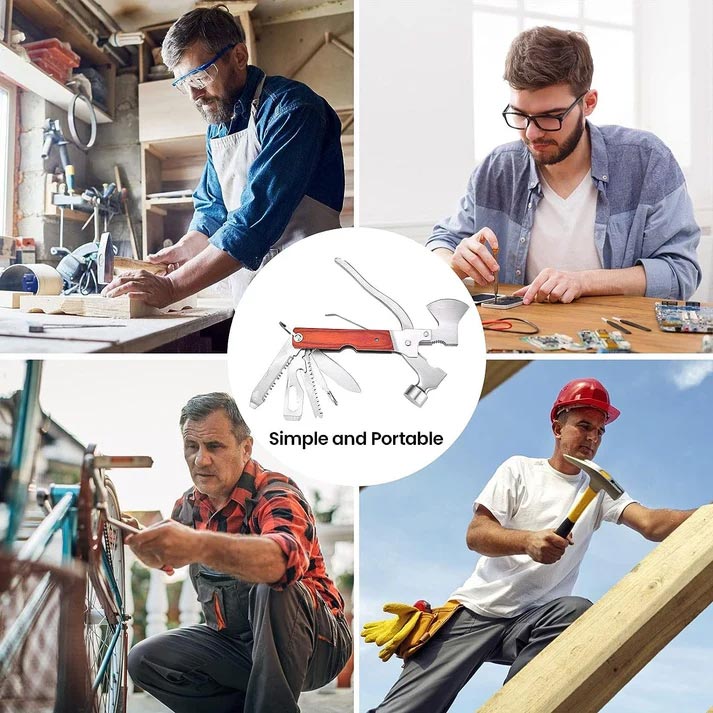 HEAVY DUTY SUPERIOR QUALITY: Multitool hammer use ergonomic, made of quality stainless steel, in case of emergency, this small gift gadget for men can help you hammer, cut, tighten, and fix things easily, strong enough for you to get tough jobs done. Besides, the handle adopts wooden materials to provide a comfortable grip.