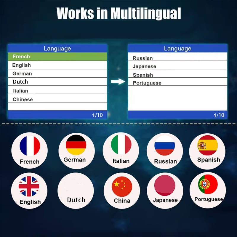 MULTI-LANGUAGE SUPPORT: Supports 10 languages: English, German, French, Spanish, Italian, Russian, Dutch, Chinese, Japanese, and Portuguese—ideal for global drivers.