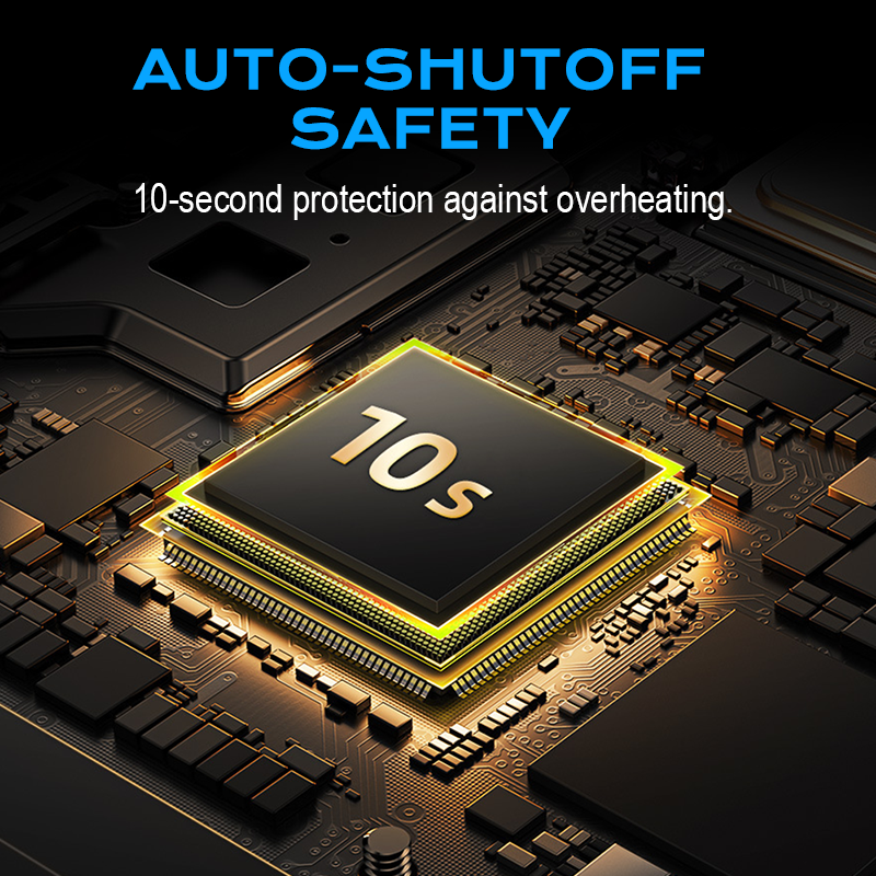 ADVANCED SAFETY FEATURES: Equipped with an IC smart chip that automatically cuts power after 10 seconds of continuous use, preventing overheating and potential hazards. The thickened flat tungsten heating element activates via a slide switch and instantly extinguishes when released, thanks to an auto-return mechanism.