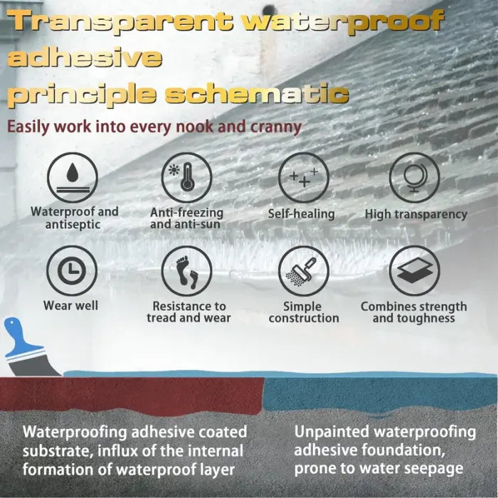 Our waterproof adhesive is a quick and efficient solution to the problems above. It can fill seams, cracks and prevent leakage with just one brush, simple and convenient.