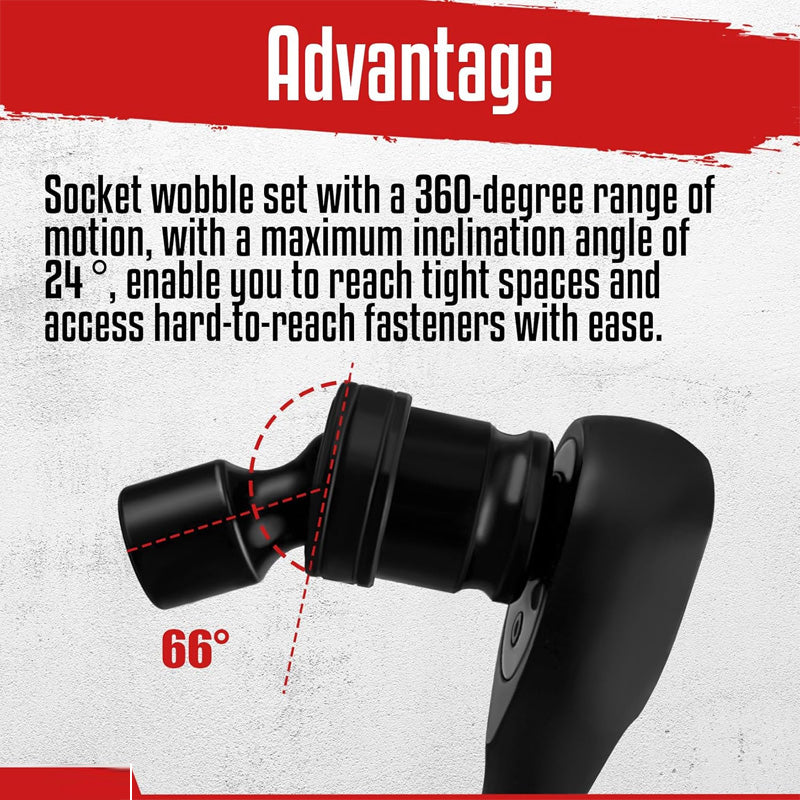FULL 360° MOTION FLEXIBILITY: The wobble socket set offers a full 360° range of motion with a 24° maximum tilt angle. This feature helps you access tight spaces and hard-to-reach fasteners with ease and precision.