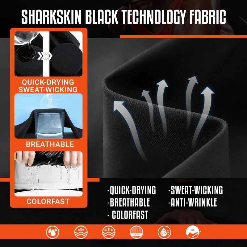 Sharkskin black technology fabric, moisture absorption, quick-drying, sweat-wicking, breathable, comfortable naked feeling, flexible, and high elastic.