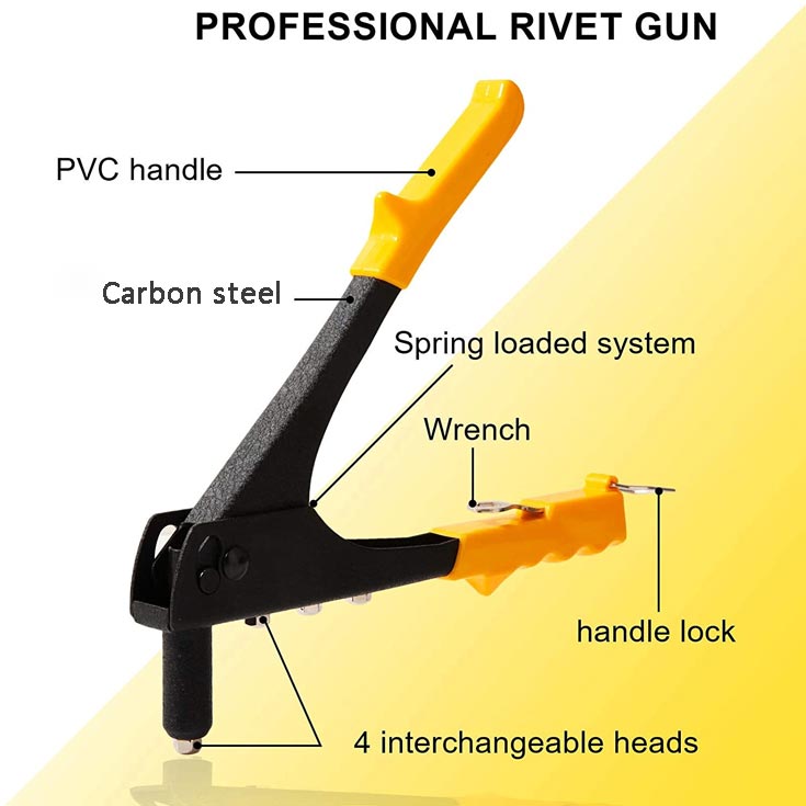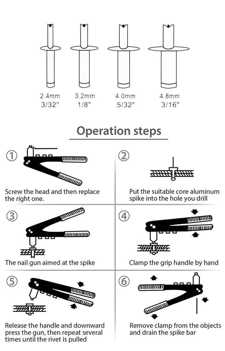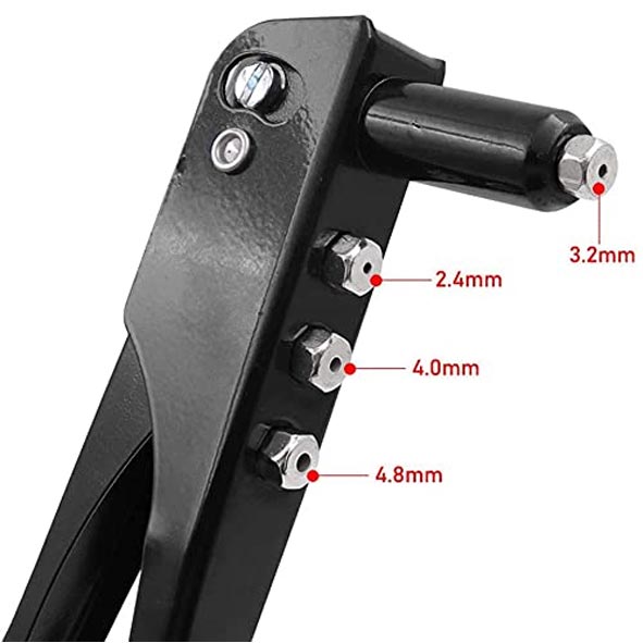 The lightweight design ensures easy operation and the adjustable riveting force allows you to set the desired rivet size. Applicable For Rivet Size 2.4mm, 3.2mm, 4.0mm, 4.8mm Rivets.