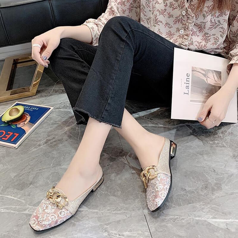 Summer New Mesh Square Toe Low Heel Slip-on Sandals Fashion Half Slippers