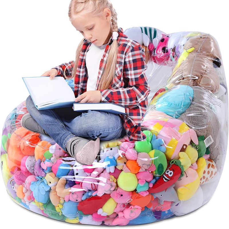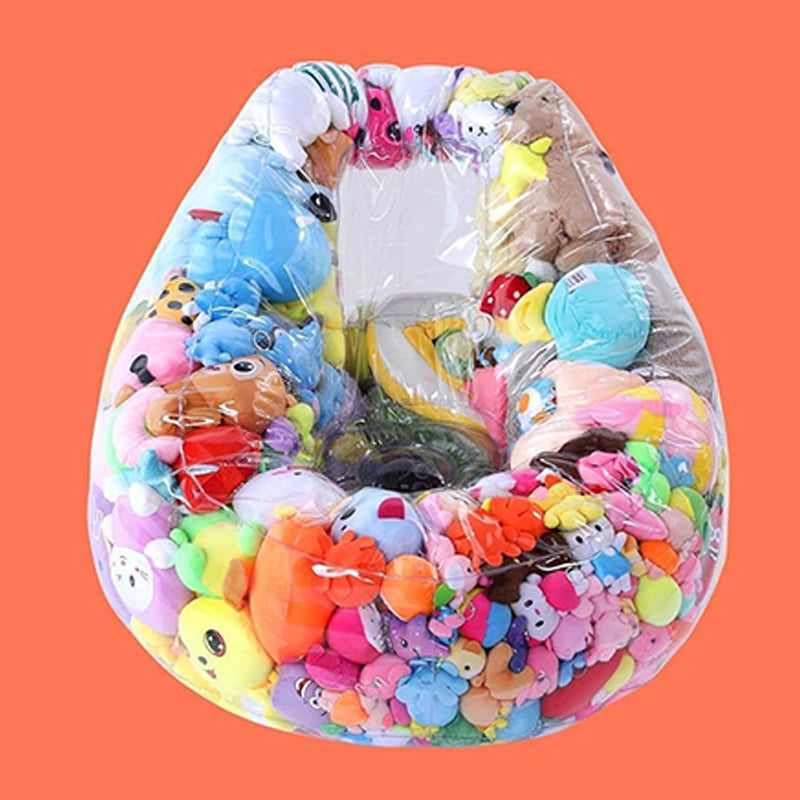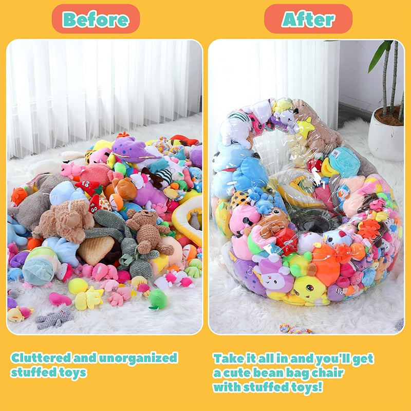 TRANSPARENT STORAGE DESIGN: Transform your cluttered collection of stuffed animals into a functional and stylish piece of furniture. It’s a smart, zero-cost way to repurpose beloved toys into practical seating for any room.