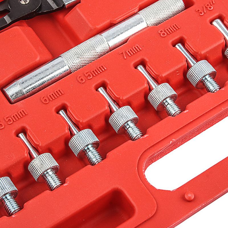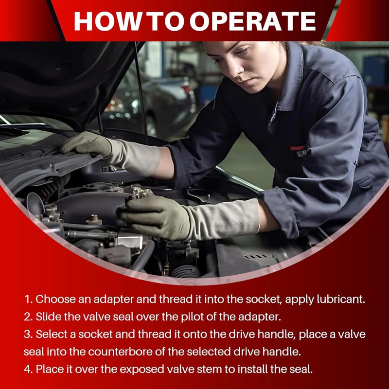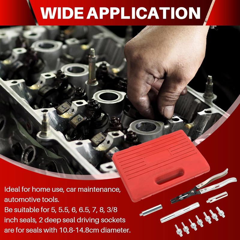 COMPLETE SET: The valve stem seal removal tool kit includes (1) valve stem seal pliers + (1) drive handle + (2) seal driving sockets for seals + (7) seal driving adapters fit seals 5mm, 5.5mm, 6mm, 6.5mm, 7mm, 8mm, and 3/8” + (1) carrying case.