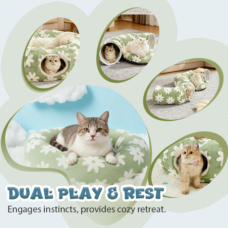 DUAL-FUNCTIONAL DESIGN: Combines a playful tunnel with a cozy bed, encouraging natural feline instincts. Includes a furry ball for interactive play and a central resting area, offering cats both stimulation and comfort in one practical, engaging unit.