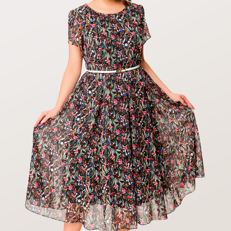 The floral dress with delicate white belt is a style of effortless elegance. This stunning dress is designed to make you look and feel fantastic. The round neckline and short sleeves are classic and versatile, while the lightweight and breathable fabric ensures a comfortable fit and freedom of movement. The dress is adorned with a beautiful floral print that adds femininity and sparkle. The delicate white belt accentuates the waist and highlights the silhouette, adding to its style. Whether you're heading to a garden party, a brunch date, or looking to elevate your everyday look, this dress is the perfect choice. It’s a must-have wardrobe piece that will effortlessly radiate elegance and femininity.