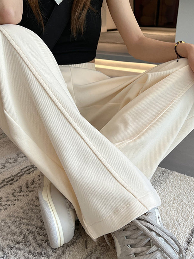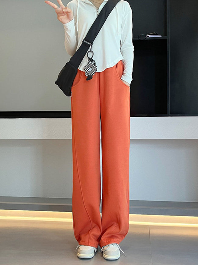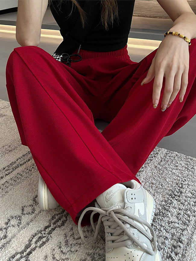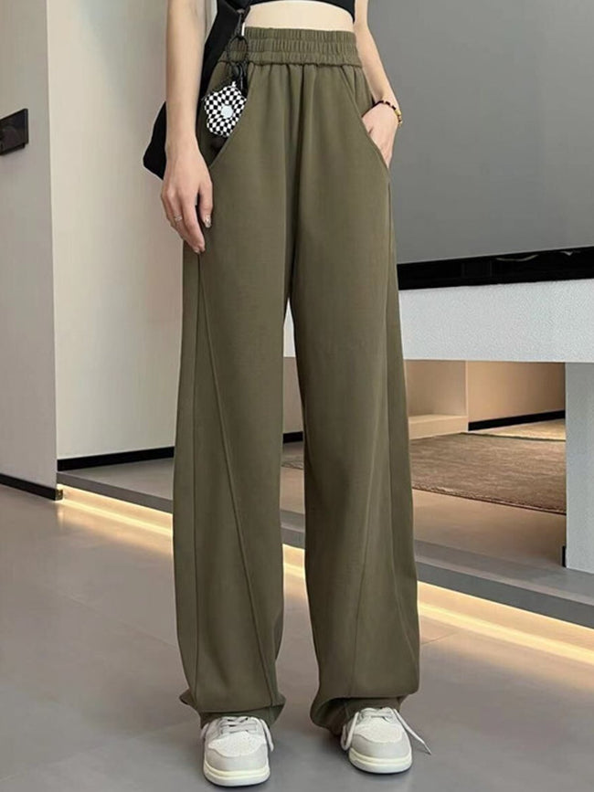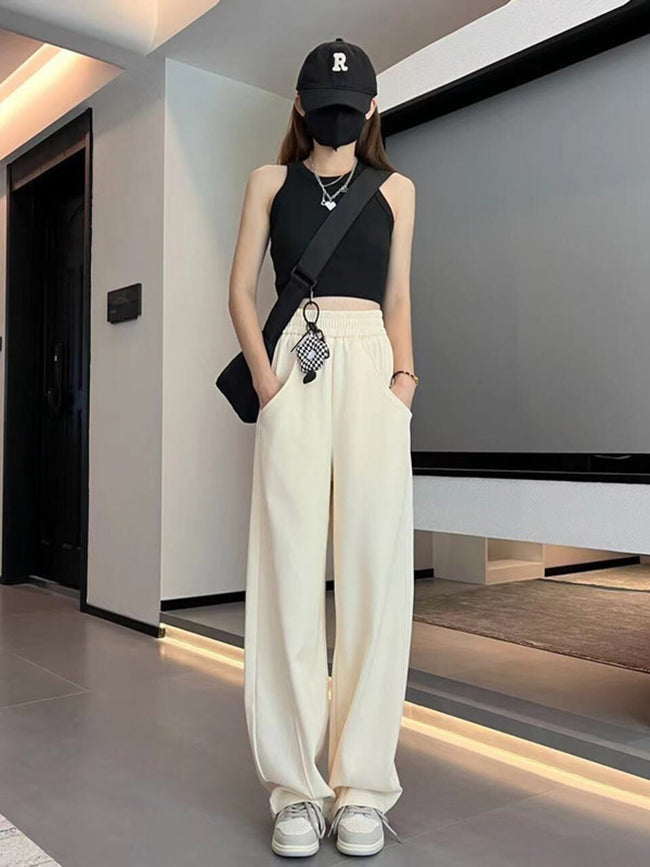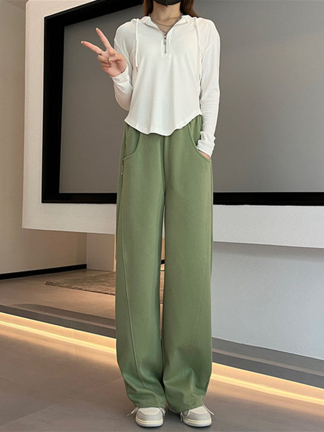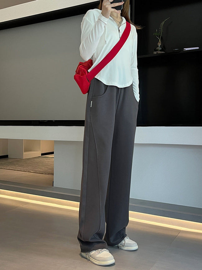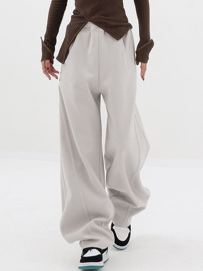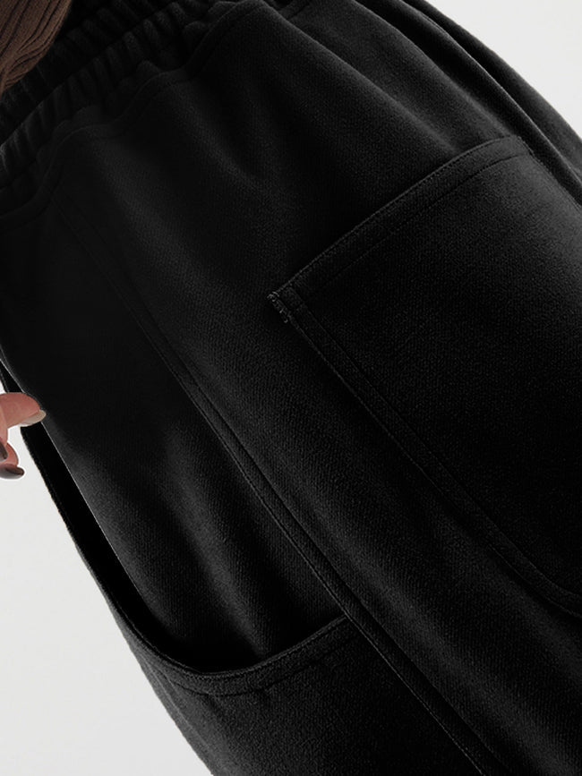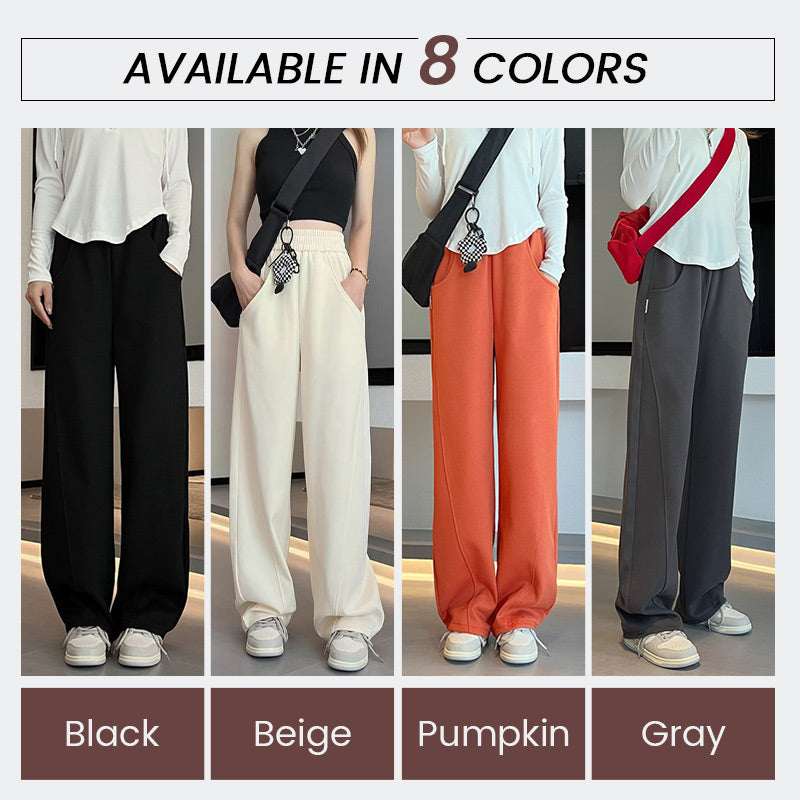 This is a pair of baggy elastic waist wide-leg sweatpants with two deep pockets. It's made with cotton and polyester. Shape your leg figures, properly stiff and smooth version.